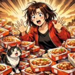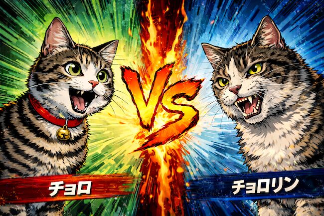 目の前で、自分のごはんを食べている猫(チョロリン)がどうしても許せないらしい。