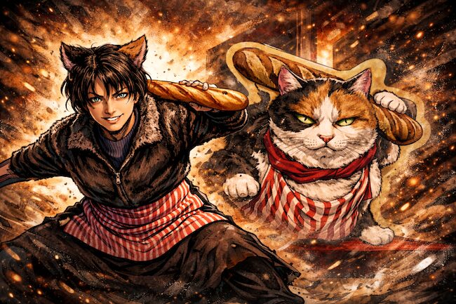 猫耳。赤いシマシマ前掛け。右手にフランスパン。